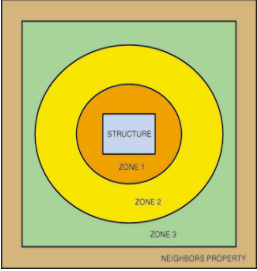 Zone 1 would be  15 feet in any direction from the outside of your house, having no flammable plants or even firewood, which should be located a reasonable distance away. Zone 2 would be an extension from zone 1, a total of 75 to 125 feet from the house. Keeping flammable debris like dead leaves, branches, or pine needles must be kept in check. If there are trees or shrubs, it may be good to have them spread out, so as to slow a fire down in case one did occur. Zone 3 would extend beyond zone 2 and to the property limit.